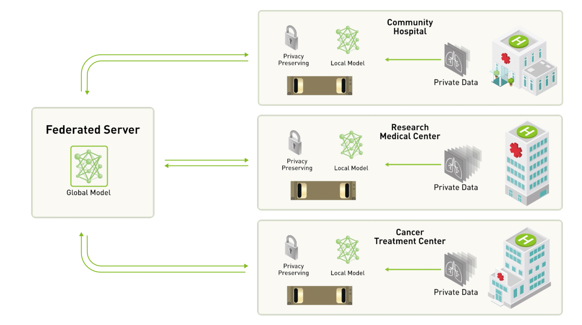 Federated learning uses a client server model, where each client trains a copy of the global model on its own dataset. The parameter updates from each client are sent to the server, where they are averaged and used to update the global parameters. A copy of the updated global parameters are then distributed to each client, and the process iterates. In our hospital example, this means that each hospital uses its own set of patient information for the gradient computation, and sends its gradients (which notably doesn’t contain any patient information) to the server for averaging. The server then updates the global parameters and redistributes them to all hospitals. The beauty of federated learning is its simplicity. We really only have four hyperparameters: